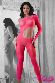 Asymmetrical mesh footless bodystocking with long sleeve, bust opening and wide side opening.