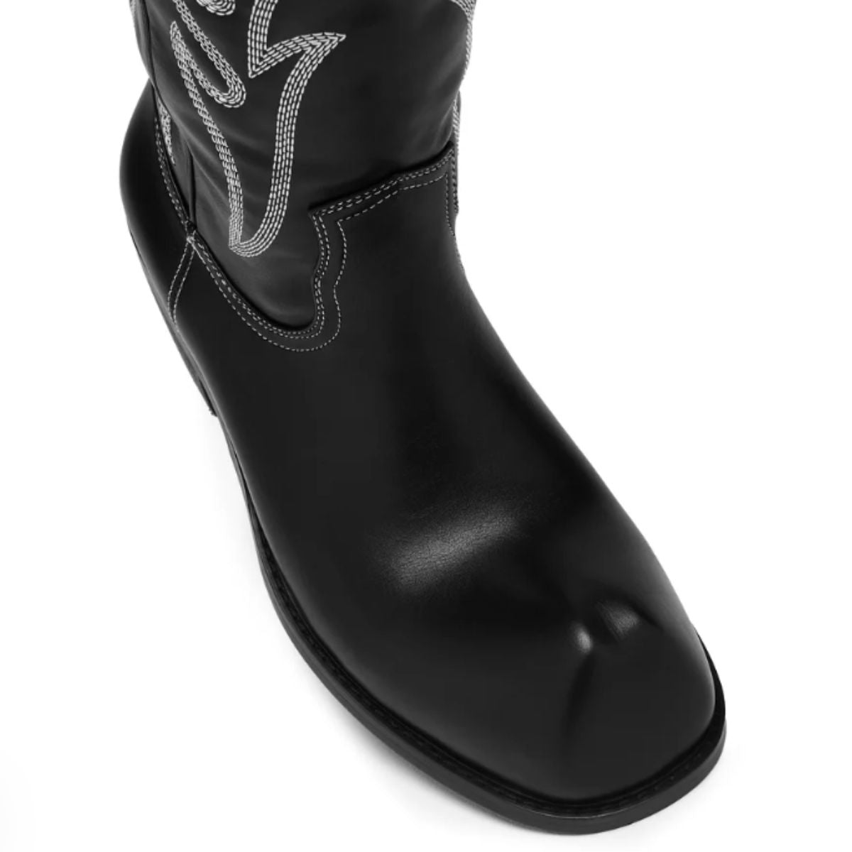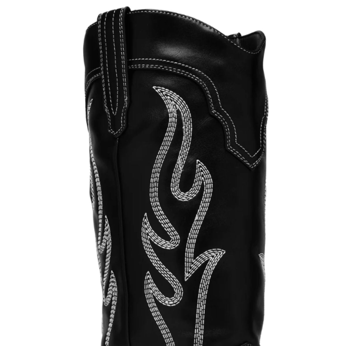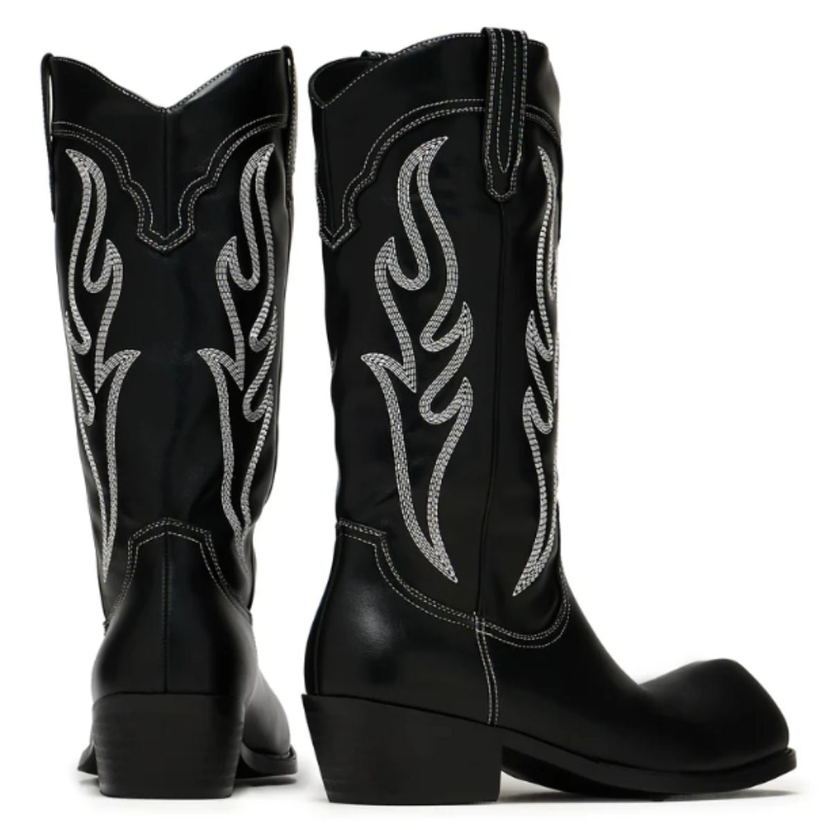 Tall shaft. Curved pull tabs. But instead of soft suede and tan, you get black faux leather with a slick finish and high-contrast flame stitching. We flipped the script — no snakes, no studs, no rhinestones. Just engineered presence.