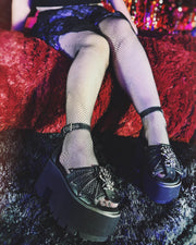 This sandal has a 3 1/2" chunky heel and a 2 1/4" cut-out platform with a stylish ankle strap. The front features a fishnet batwing design with corner wing studs and an ornamental skeleton buckle for a unique, edgy touch.