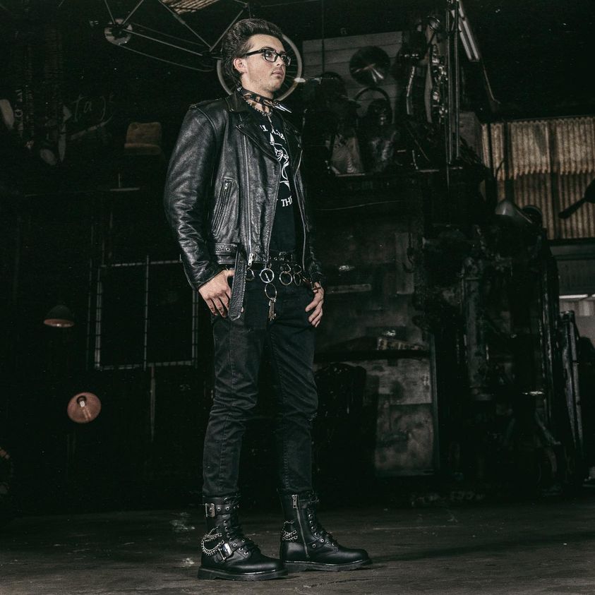 All about those chains! Bold 1 1/4" (32mm) heel 10 eyelet unisex mid-calf combat boot featuring grommet buckle straps and chain details, inside zip closure.