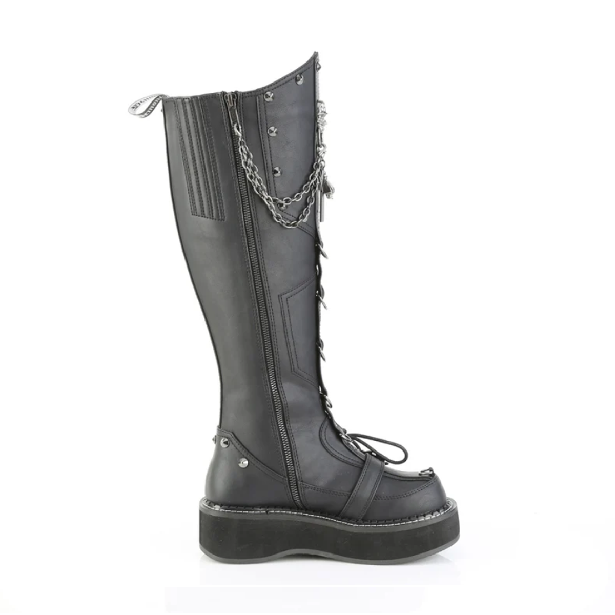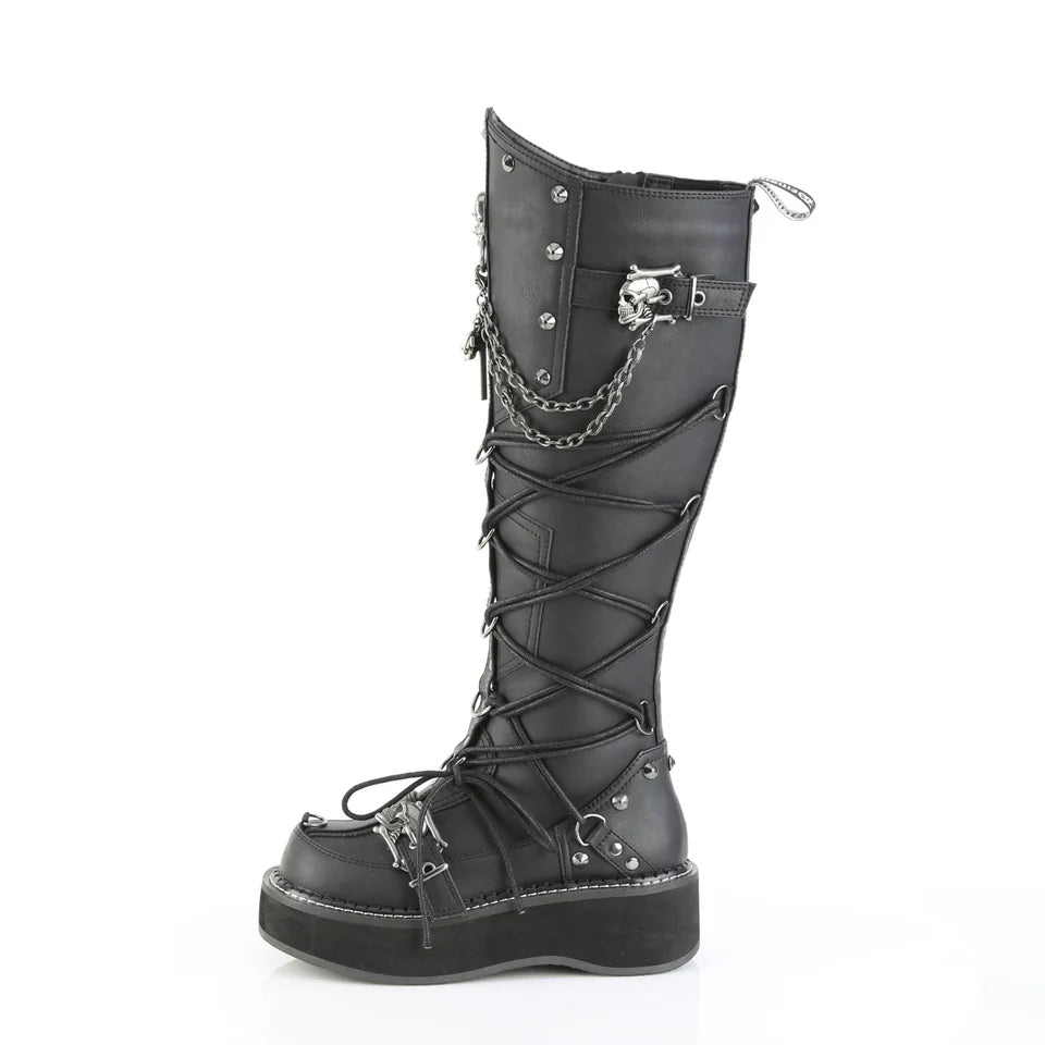 Bring the heat in these fearless 2" (51mm) platform knee-high boots, decked out with ornamental side lacing, a bold skull buckle strap, and a metal skull knocker with hanging chain accents. Finished with a full-length inner side metal zip for easy on and off.