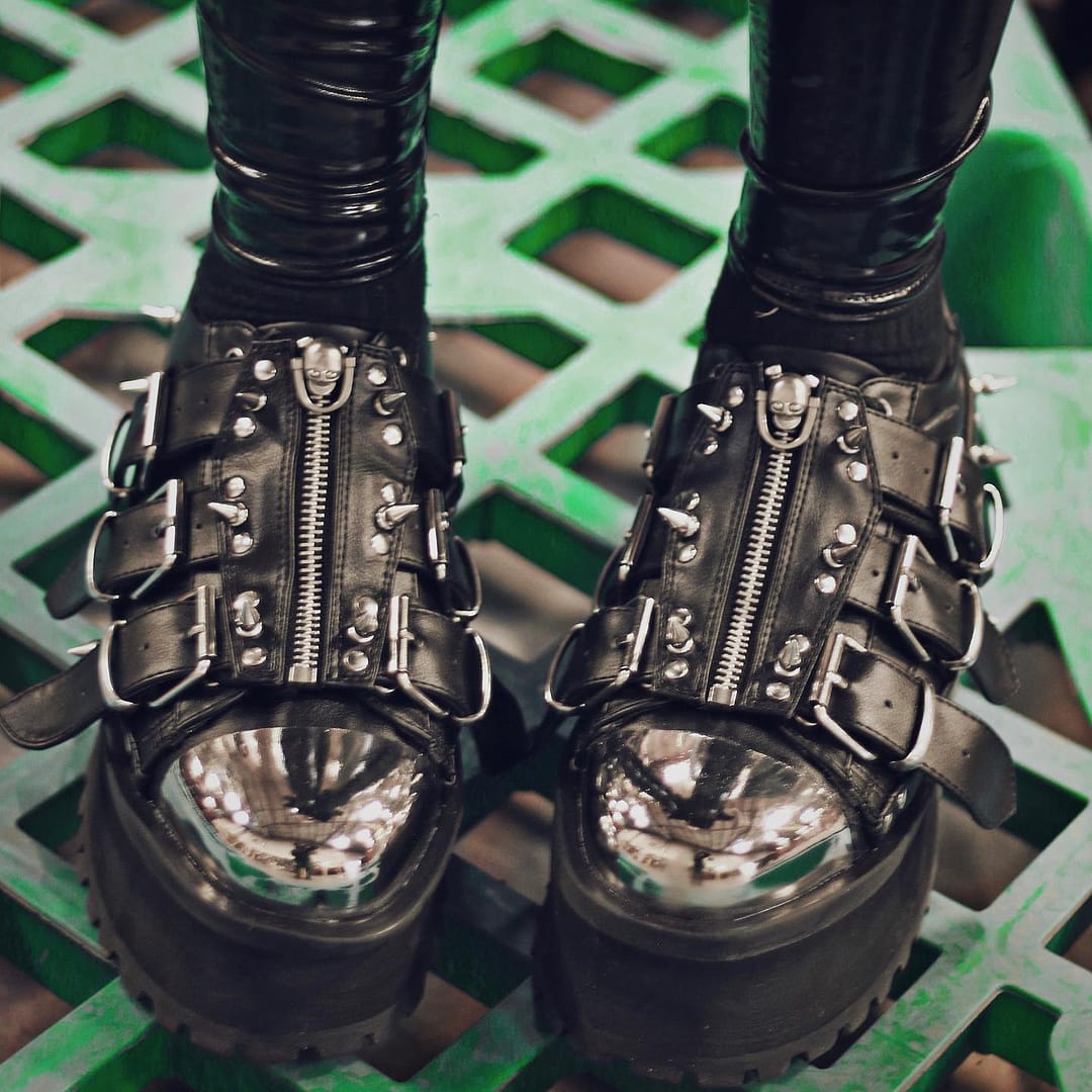 Edgy 2 3/4" (70mm) platform silver chrome plated metal toe cap lace-up Oxford with spike & flat stud details, & coffin shaped zippered buckle strap with skull head zipper head.