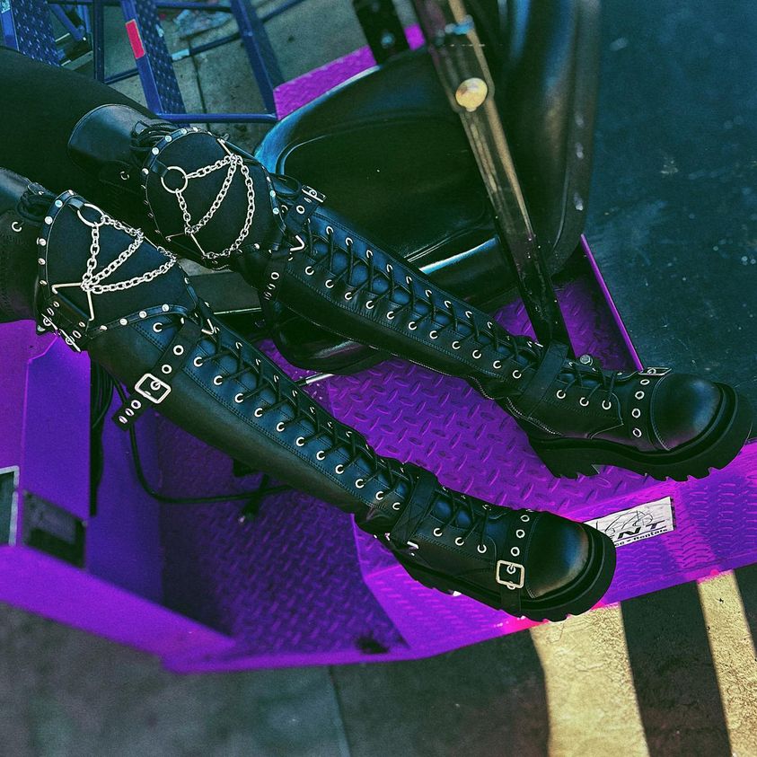 Stylish boots! A 2 1/2" tiered platform lace-up stretch over-the-knee boots featuring shield top strap with chain details, Stud and strap details, full inner side metal zip closure.