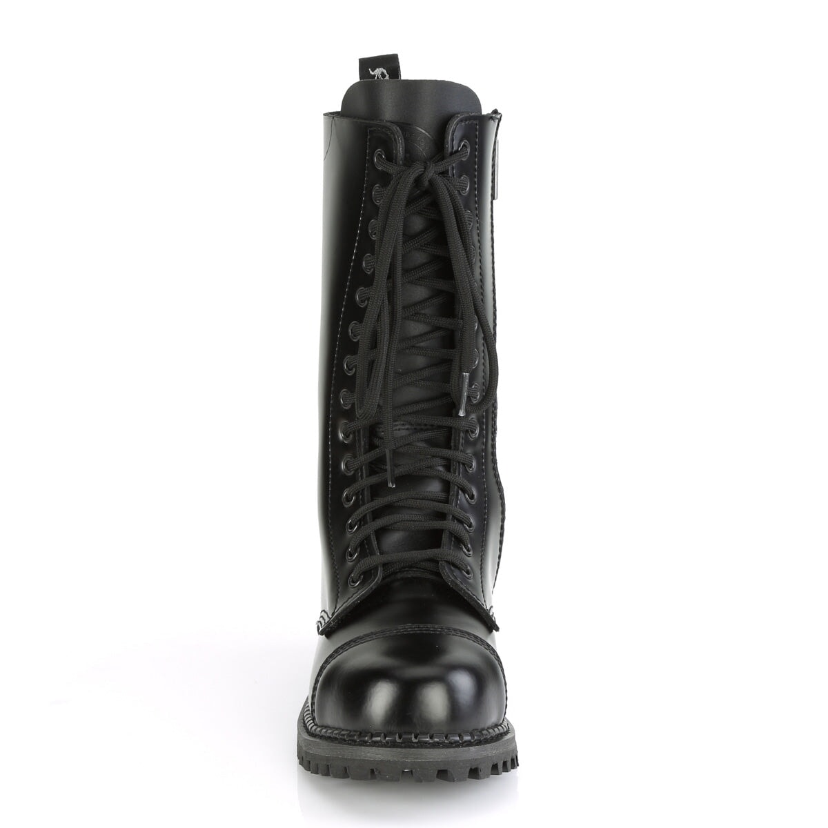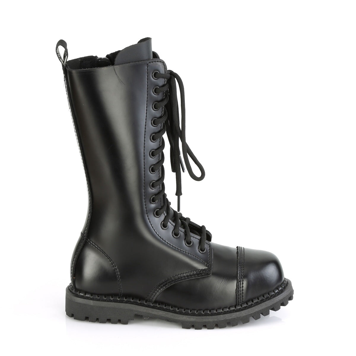 Demonia 14 eyelet unisex vegan steel toe lace-up mid calf boot with rubber sole.