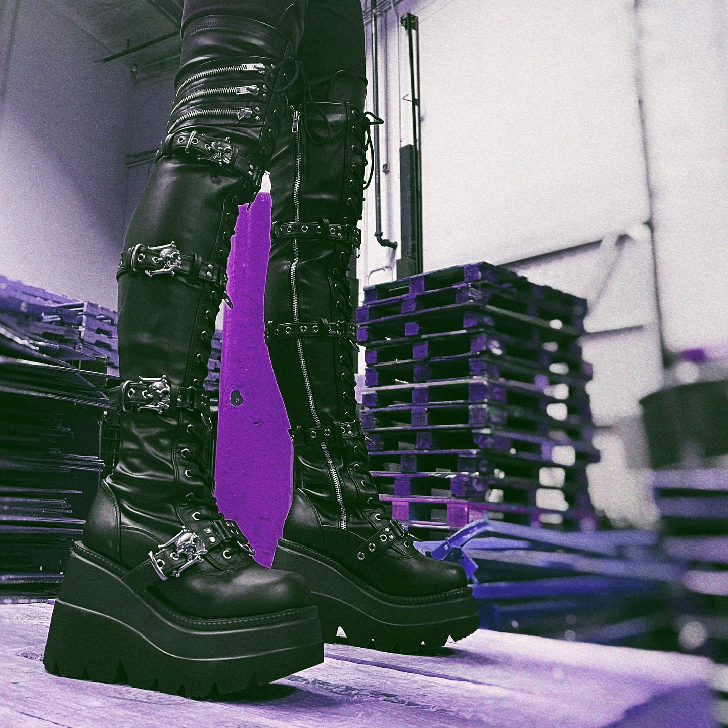 Elegant boots! This 4 1/2" (114mm) wedge platform front lace-up stretch thigh high boot w/ quadruple skull buckle strap & ornamental zip closure details on the outside , full inner side zip closure.