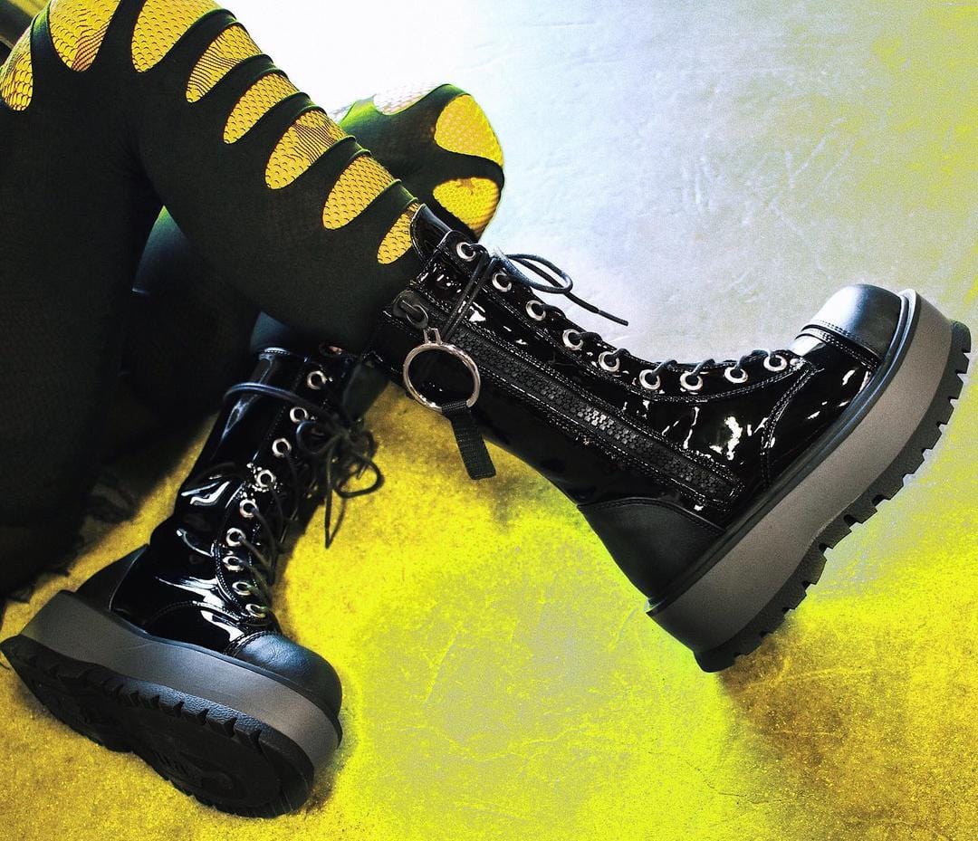 Bold 2" (51mm) platform lace-up front mid-calf boot, with oversize O-ring zipper pull, outside zip closure.