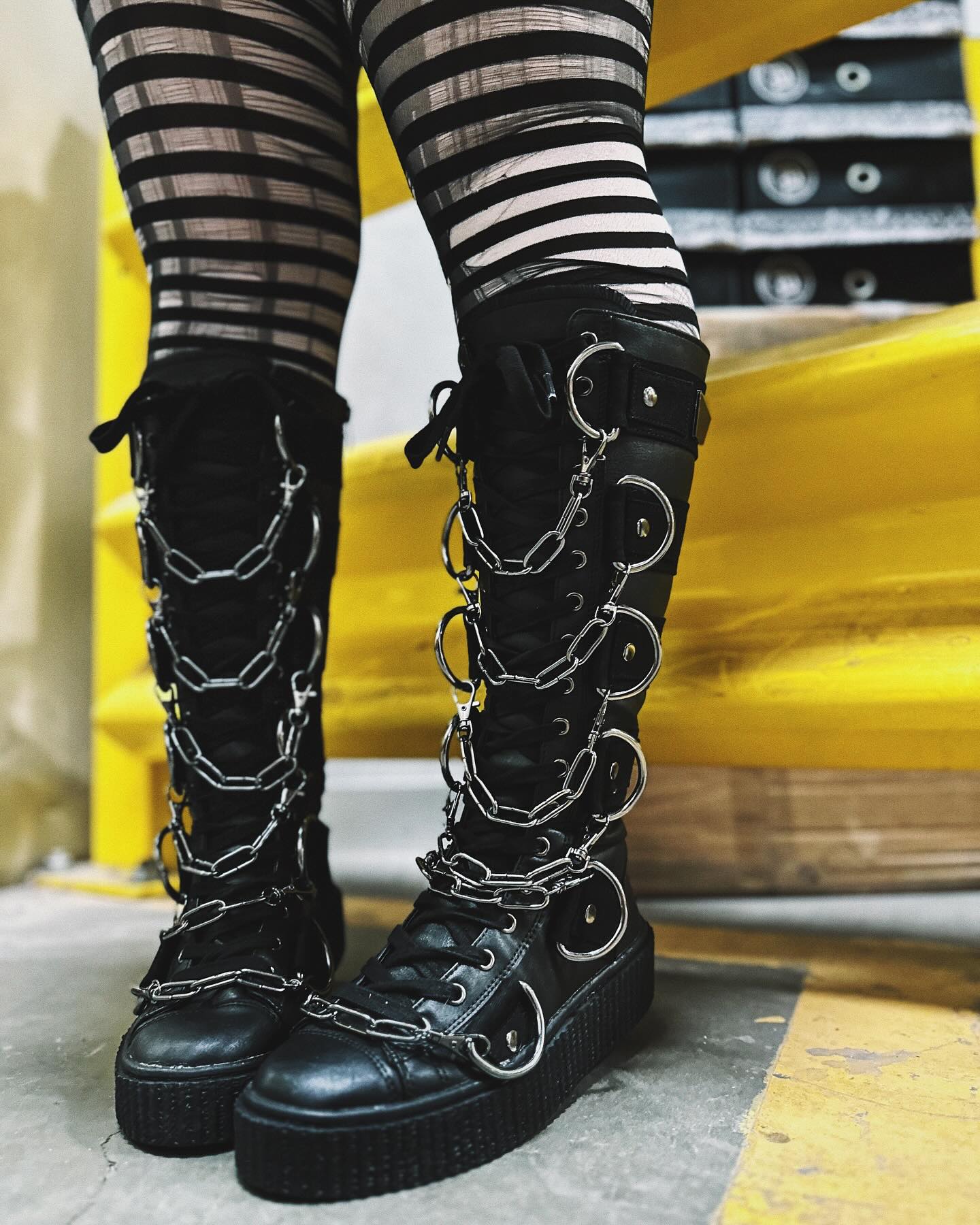 Professional yet stylish knee-high creeper sneaker boots, boasting a 1 1/2" (38mm) platform rubber sole and a round toe design for both comfort and sophistication. The stripped contrast side panels with D-rings and removable hanging chain details add a unique touch, while the oversized pyramid accents on the sides and up the back exude a contemporary edge. Complete with a full inner side metal zip closure, these boots ensure effortless wearability and a polished look.