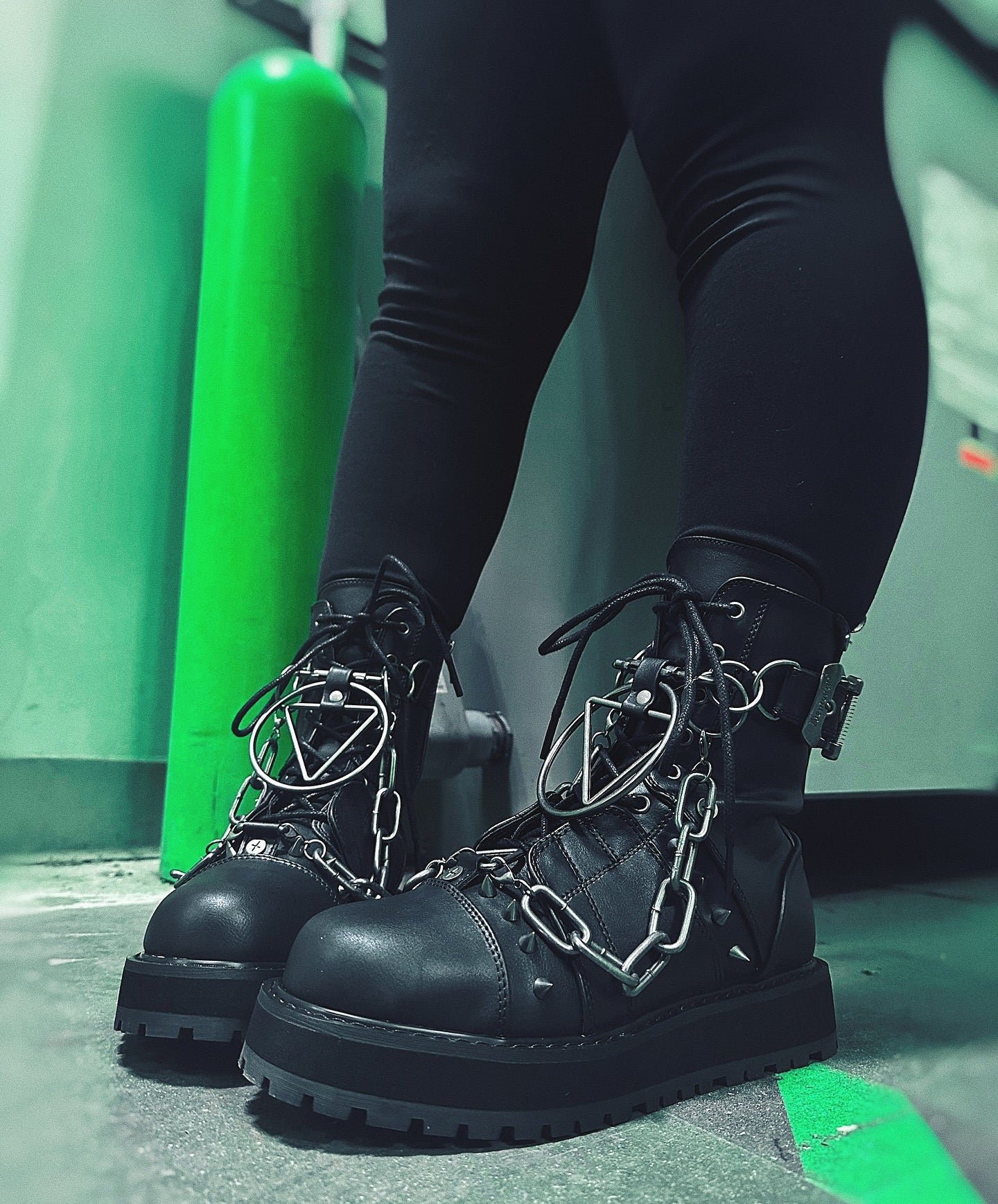 This ankle boot features a 1 1/2" (38mm) platform, lace-up front, outer buckle strap adorned with screw studs, spike studs, and various O-ring, D-ring, and triangle ring details with hanging chain accents. It's equipped with an inside metal zip closure for ease of wear.