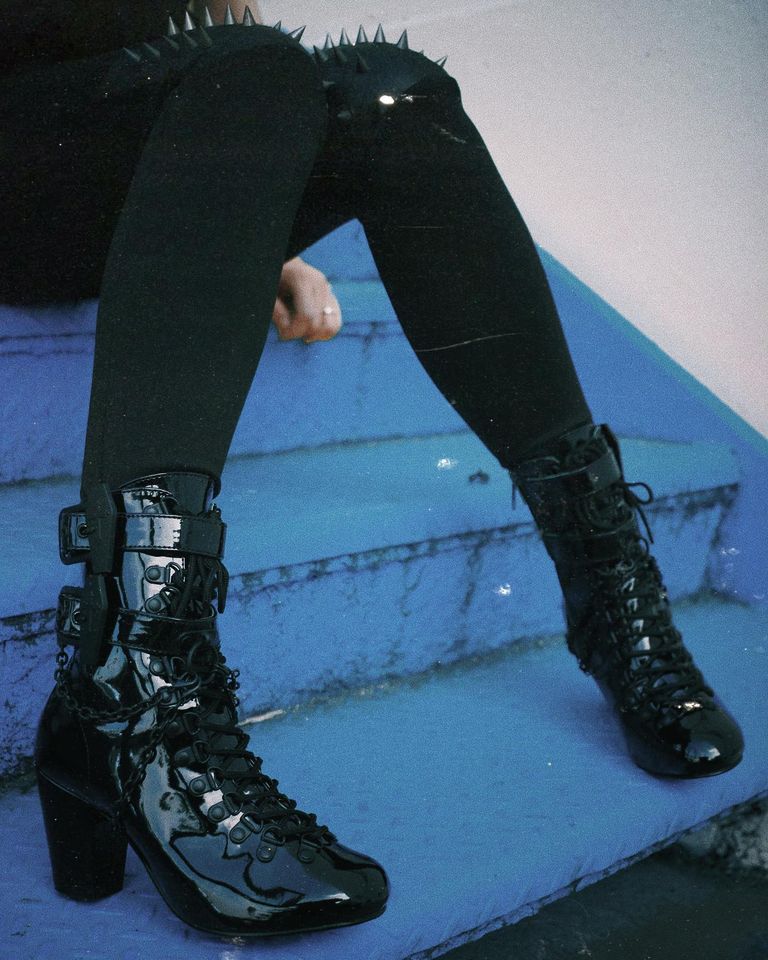 Funky 3" (76mm) block heel round toe D-ring lace-up ankle boot featuring double coffin buckle straps with O-ring plate and double hanging chain draped through the heel channel & wrapping the heel.