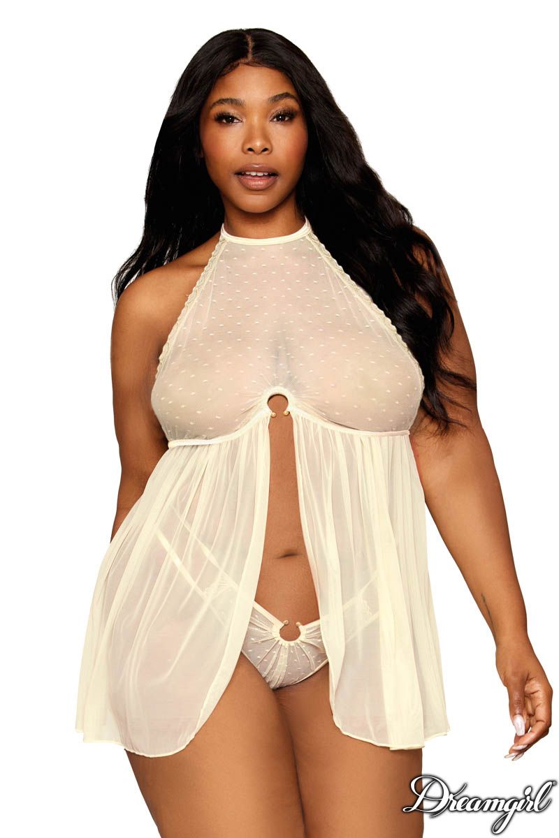 Dot mesh babydoll with a heart lace trim, a high halter tie-neck closure and a golden horseshoe ring over a flyaway open front mesh skirt. (matching strappy G-string included)