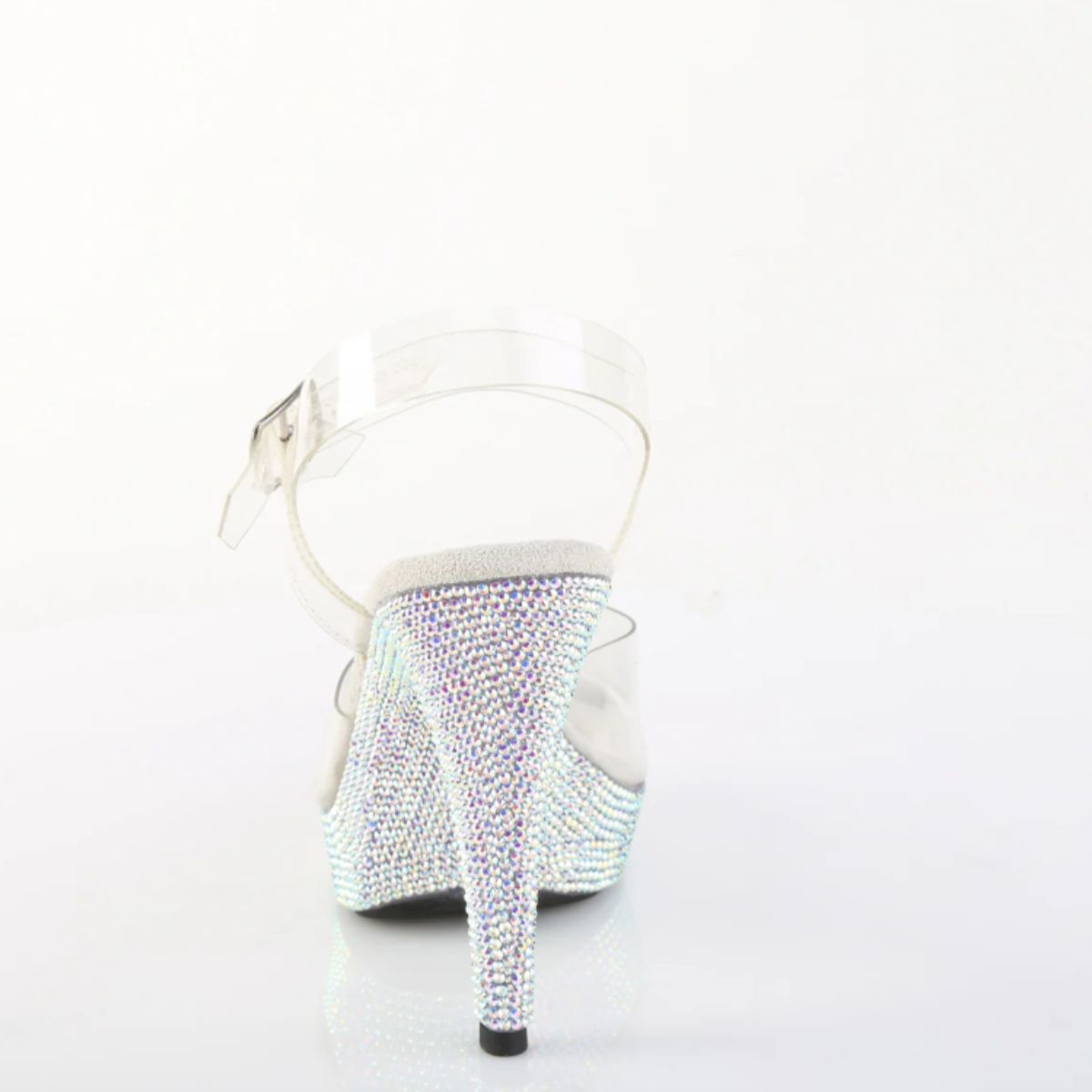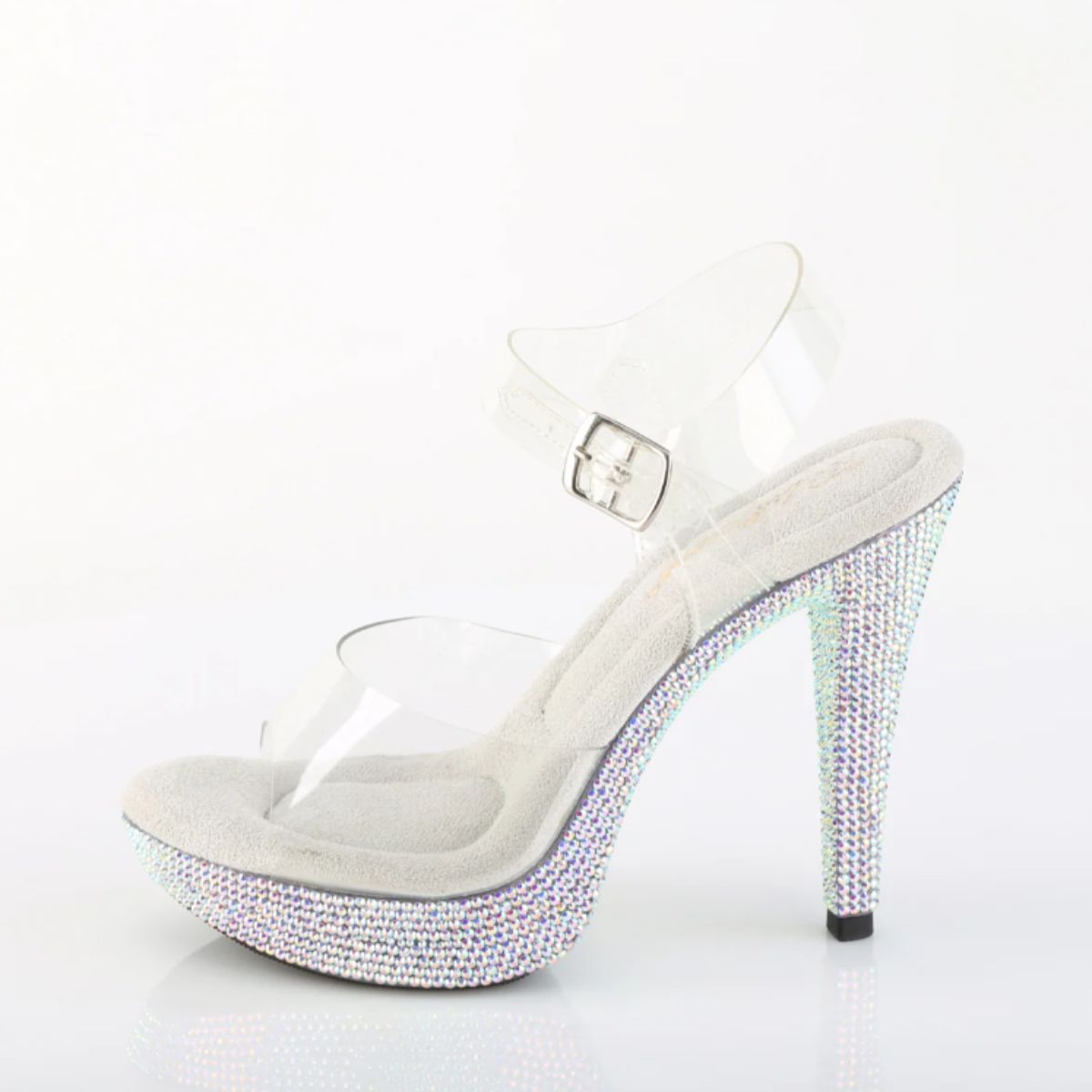 This ankle strap sandal features a 5" heel and a 1" platform for a stylish lift. The entire platform bottom is encrusted with sparkling rhinestones for a dazzling touch.