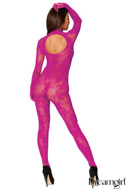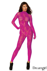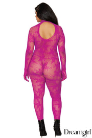 Seamless floral lace footless catsuit with long sleeves, built-in fingered gloves, a high stretch lace collar with a neck snap closure, a keyhole back cutout and stretchy foot stirrups to loop under the feet. (G-string not included)