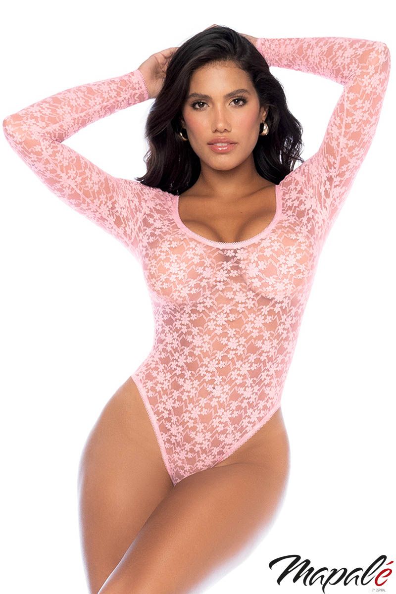 Sheer floral lace teddy with long sleeves, a round neckline and a hook & eye crotch closure.