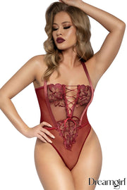 Sheer mesh teddy featuring a metallic floral lace overlay, an adjustable lace-up front, soft cups, a silky halter tie-neck collar and 2 hook closures over the back.