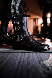 The stacked biker sole grounds the boot with weight and authority, while silver crucifix hardware, dual buckle straps, and metal toe guards create a silhouette that feels both ceremonial and confrontational. Every detail is intentional—nothing ornamental, nothing accidental.