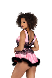 2PC Satin & Lace Babydoll with Tie & Faux Feather Detail