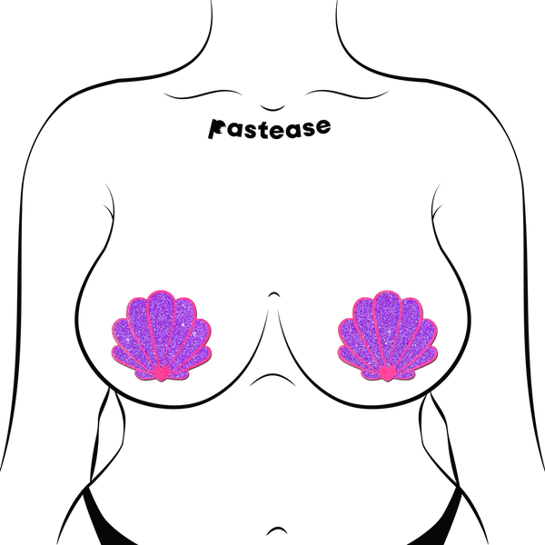 Introducing our Mermaid Seashell Pasties in Neon Pink & Purple Glitter by Pastease® – the ultimate accessory for beach lovers and mermaid enthusiasts alike! Crafted from a luxurious blend of glitter purple with vibrant neon pink accents, these pasties bring a touch of whimsical charm to your summer wardrobe. Here's why they're a must-have: