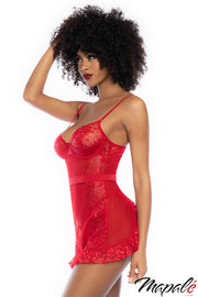 Sheer mesh apron babdyoll with a flyaway back, a thick tie-back waistband, a satin overlay on top of underwired lace cups, adjustable straps and an hook & eye back closure. (Matching heart ring G-string included)