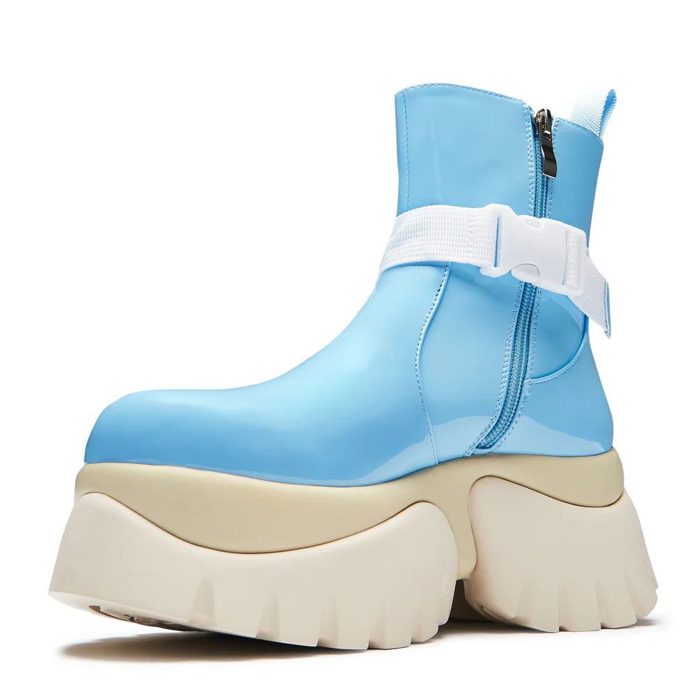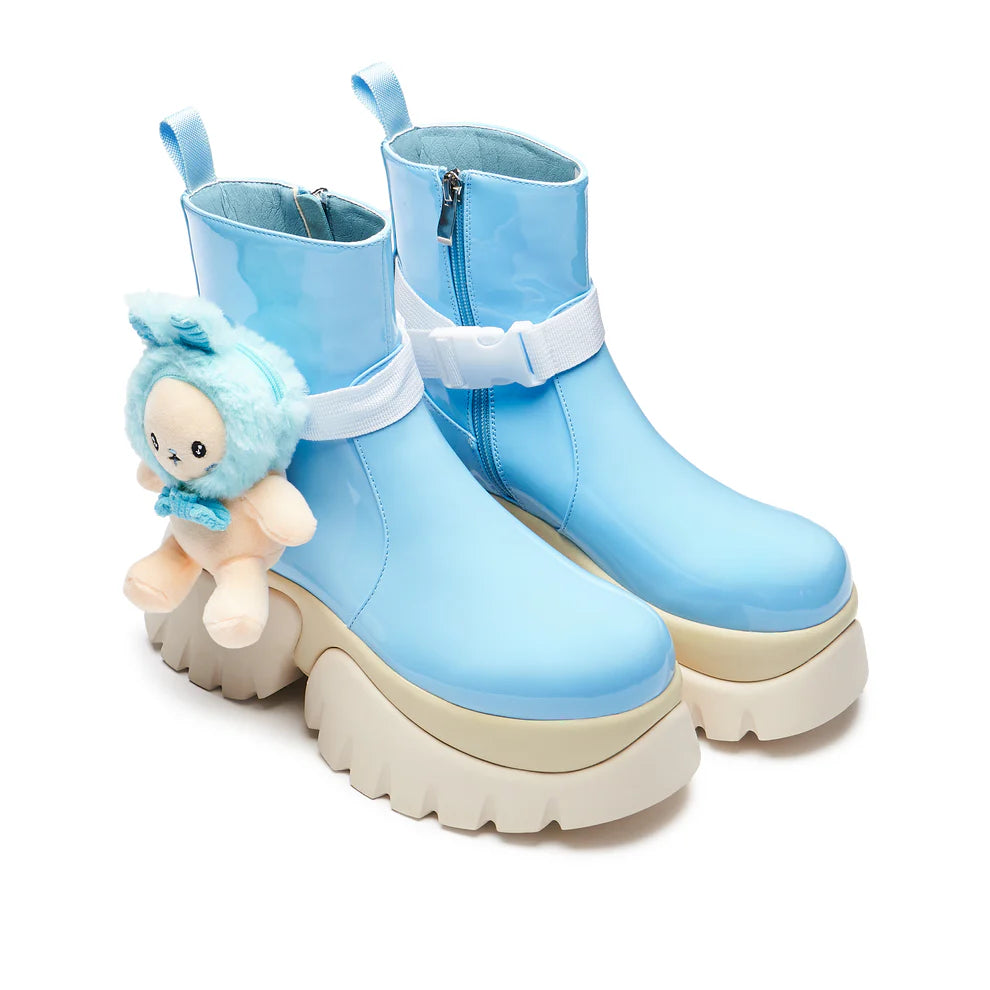 Beyond the philosophy, these boots feature a solid, super chunky rubber outsole for durability, paired with a supportive latex insole means these boots are surprising comfortable. The baby blue patent upper is both soft and supple, requiring no break-in period, while a convenient side zip allows for easy access on and off.