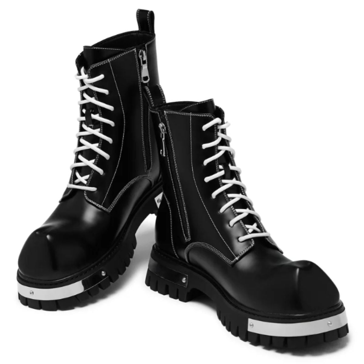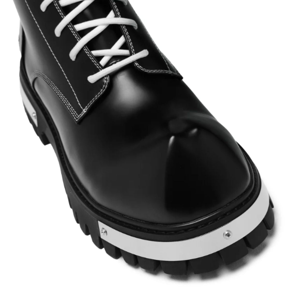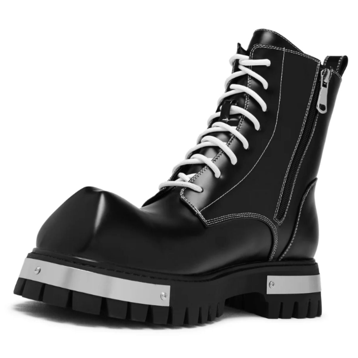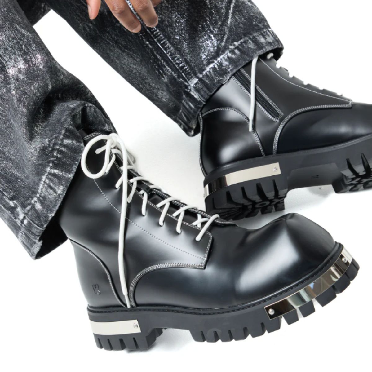 That squared, sculpted toe? It’s not subtle. It’s not meant to be. It looks like it was folded from steel. The gloss finish is sleek and sinister, but the white contrast laces and stitching slice through it like wireframe geometry.