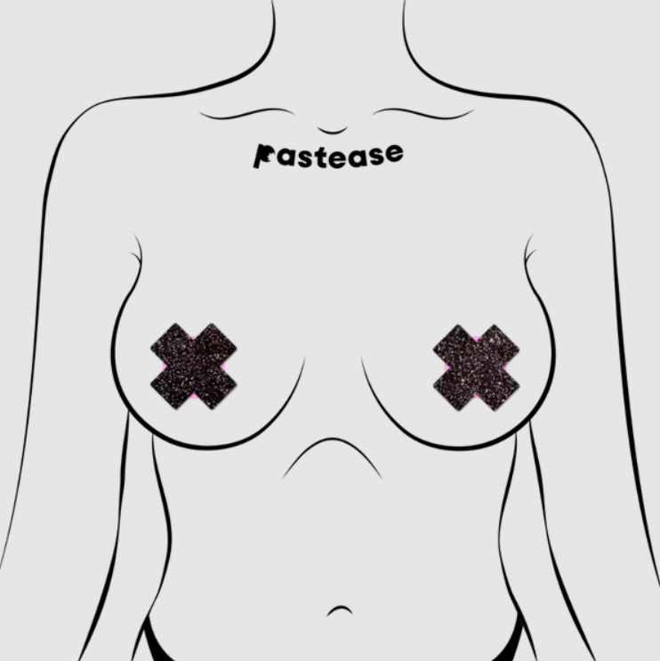 Petite Plus X: Two Pair of Small Sparkle Black Plus Nipple Pasties by Pastease® are hand-made in the USA of soft form-fitting material that forms to curves and resists wrinkling over hardening nipples.