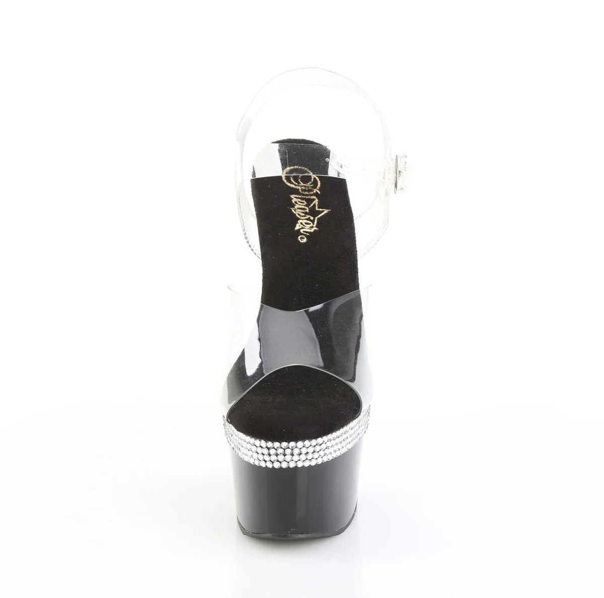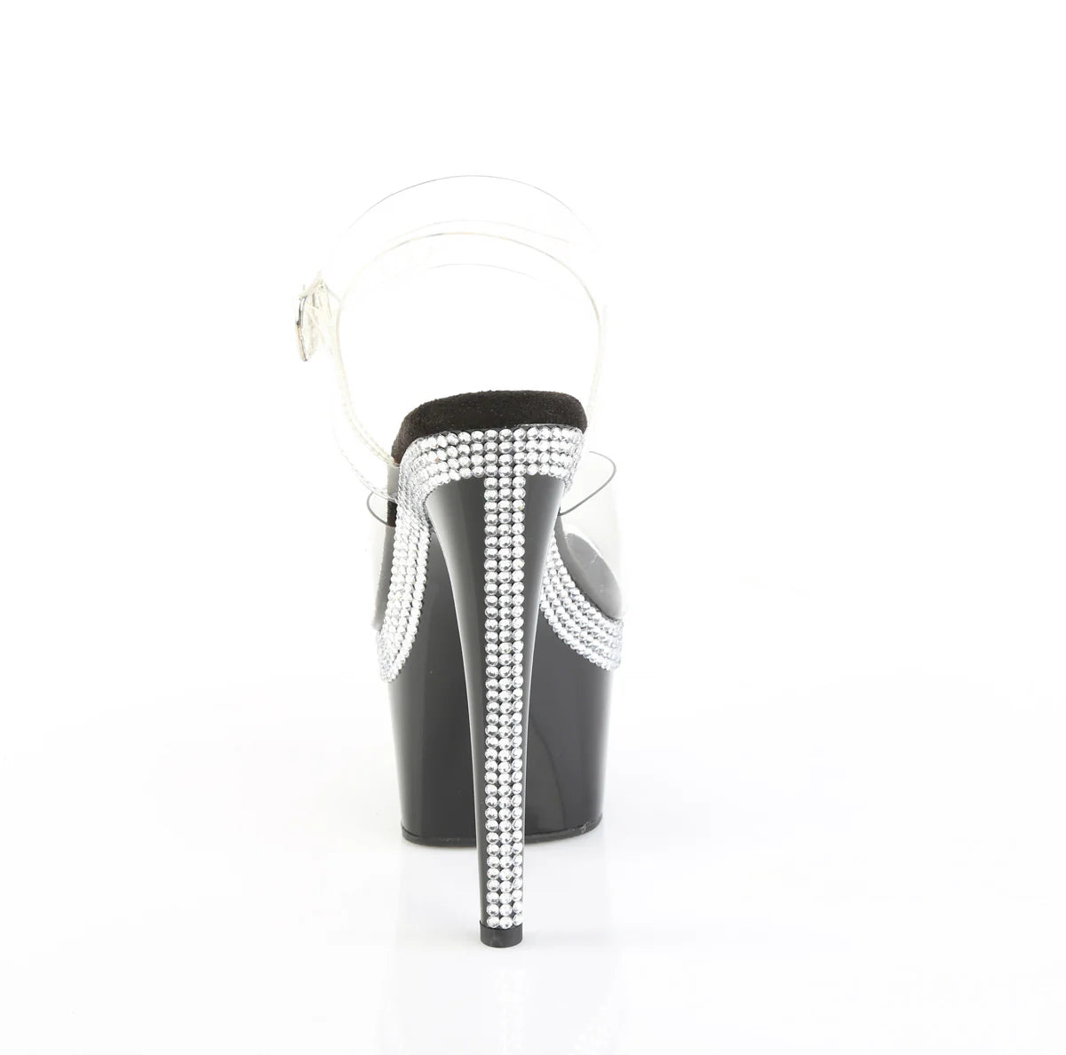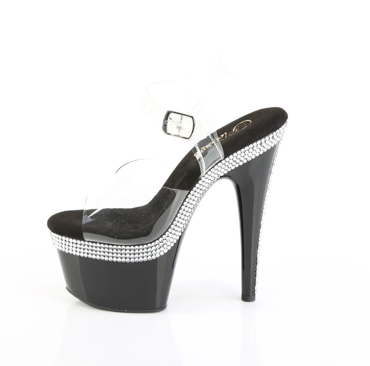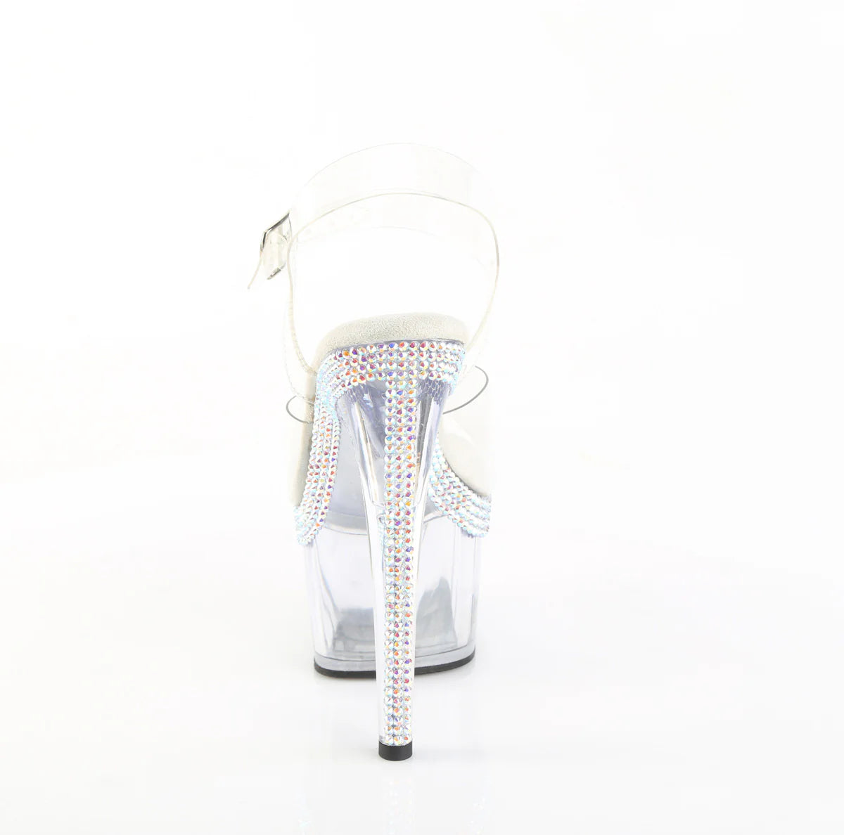 A 7" heel ankle-strap sandal with a 2 3/4" platform, decorated with multiple rows of AB rhinestones along the platform edge and heel.