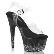 A 7-inch (178 mm) heel ankle-strap sandal with a 2¾-inch (70 mm) platform, featuring a sprinkle rhinestone design on the lower half of the platform bottom and heel.