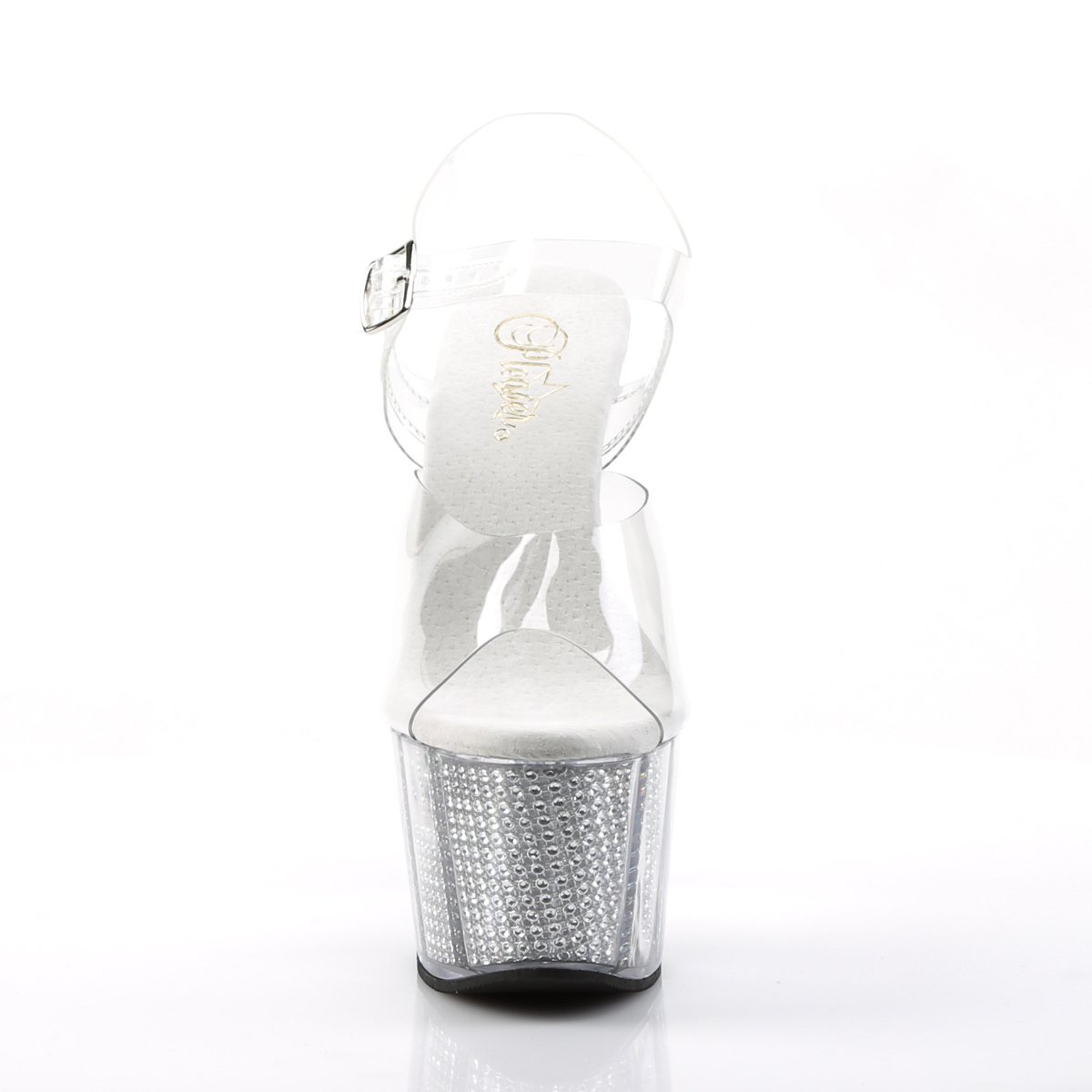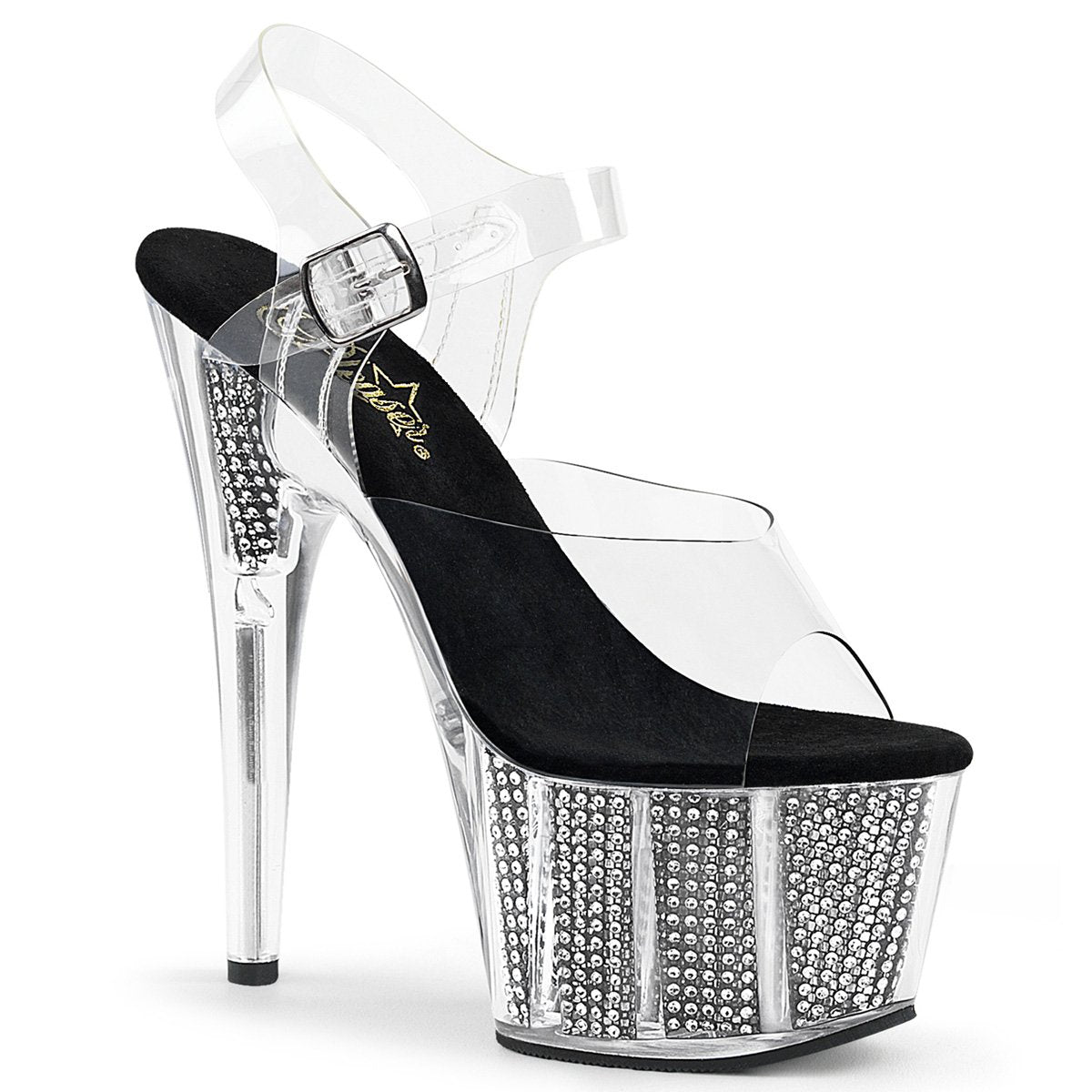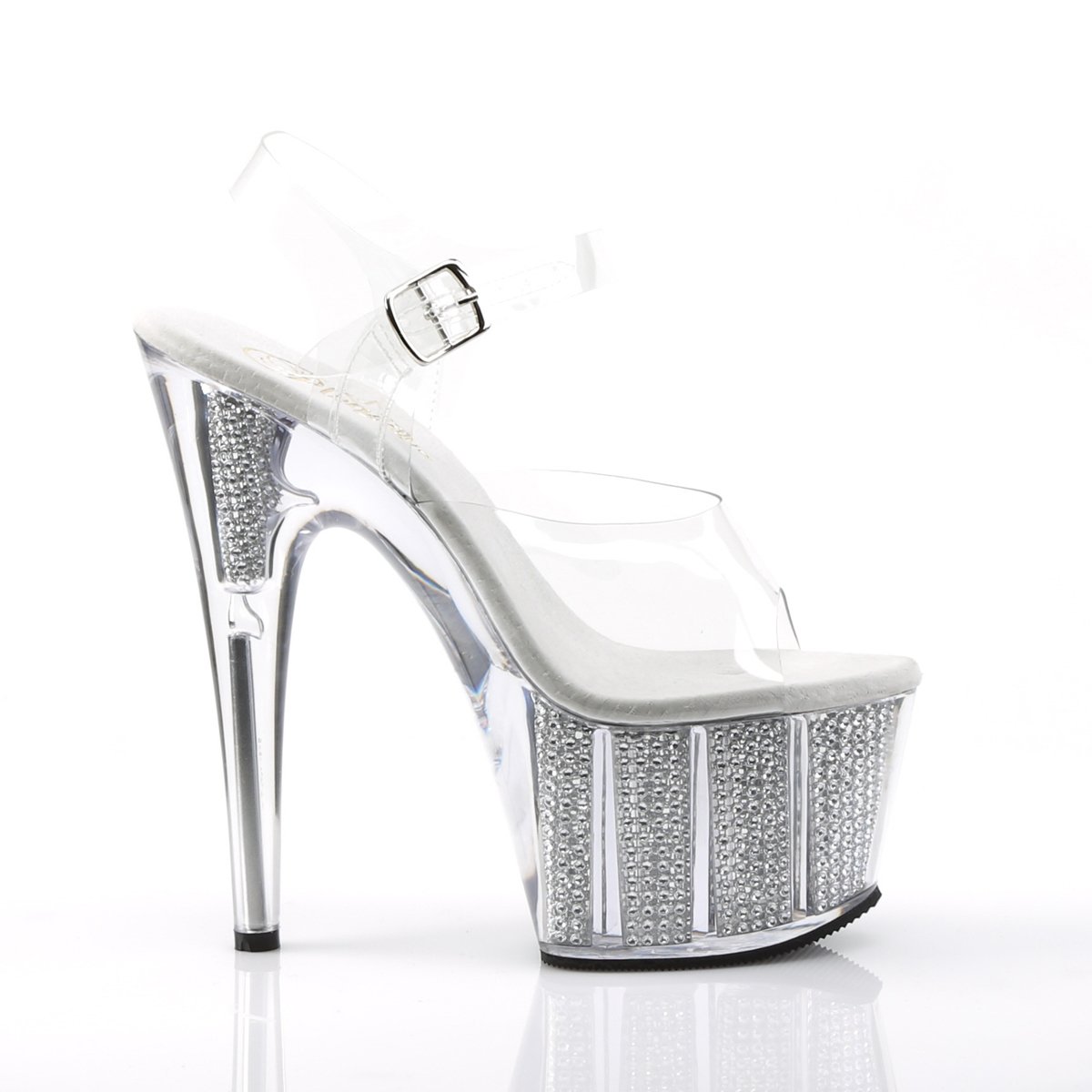 Get noticed wearing this gorgeous Pleaser 7"(18cm) heel, 2 3/4"(7cm) platform ankle strap sandal. This sandal features a chrome plated, simulated rhinestone filled platform bottom, for a little extra sexy!