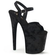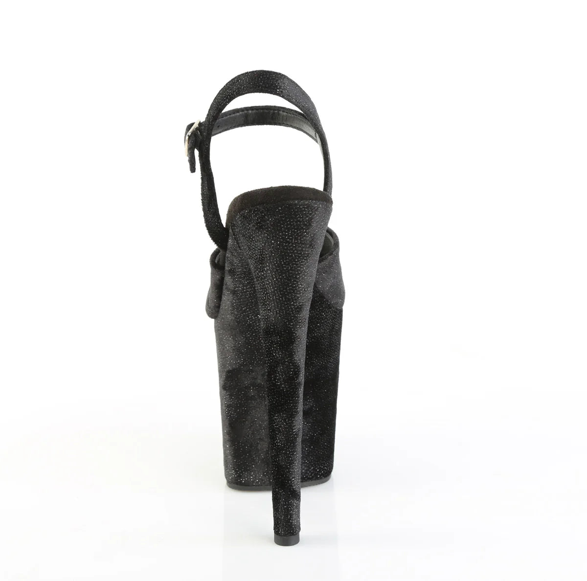 Step into the spotlight with these dazzling 8" (200mm) heel ankle strap sandals, featuring a shimmering fabric upper that commands attention. The 4" (100mm) fully wrapped matching platform brings bold height and flawless balance for a look that slays all night.