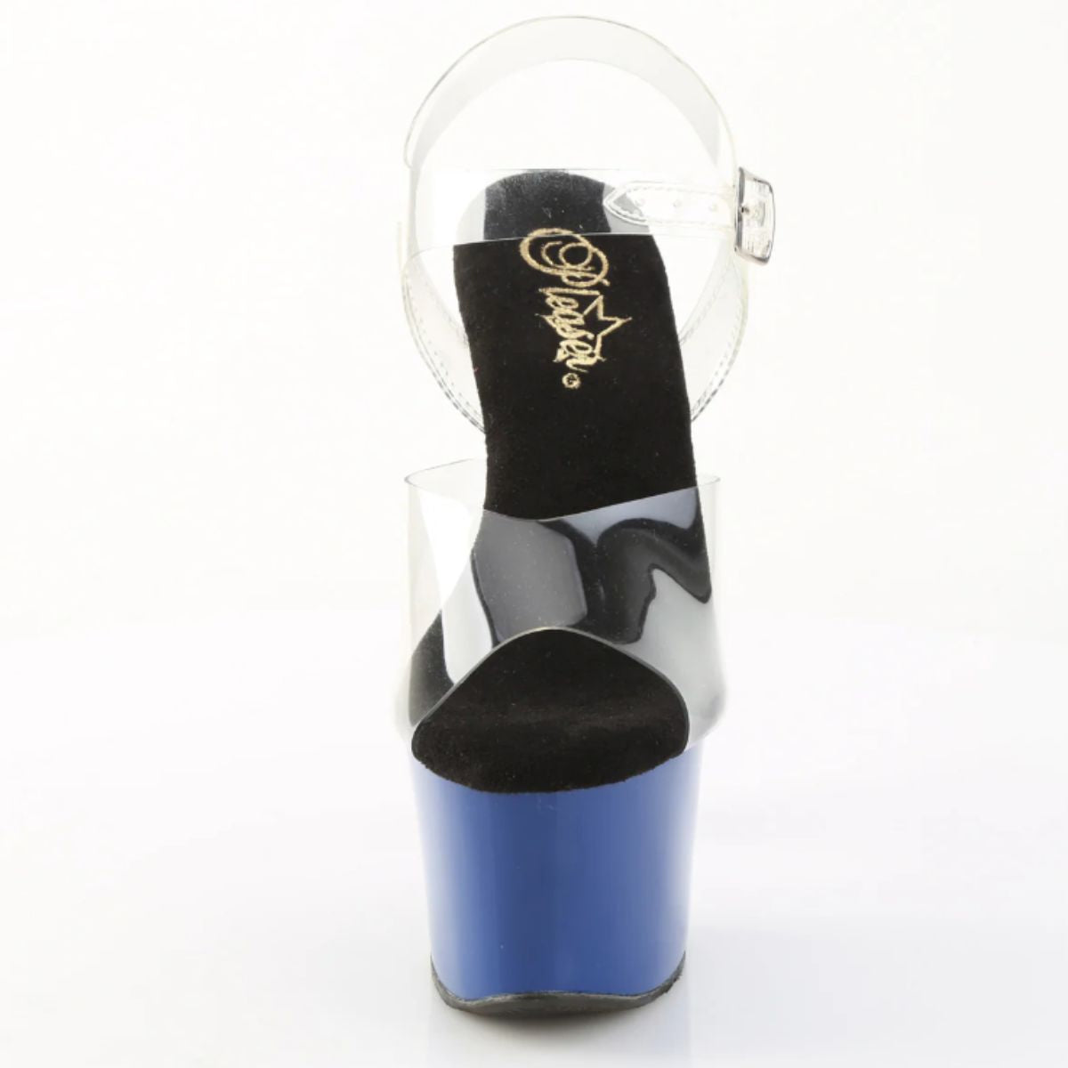 This fabulous ankle strap sandal has a dazzling stiletto heel with clear top strap. Single toe strap with wider sides, ankle strap with side metallic buckle closure and supporting side straps, 2.75 inch front platform and high 7 inch high heels. Chic and comfortable, these sandals can be paired up with a variety of outfits for a sexy look.