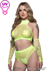 Sparkly rhinestone embellished mesh top with a racerback and high neck. Sparkly rhinestone embellished high-waisted mesh panty. Fingerless rhinestone embellished mesh gloves with thumbhole (2)