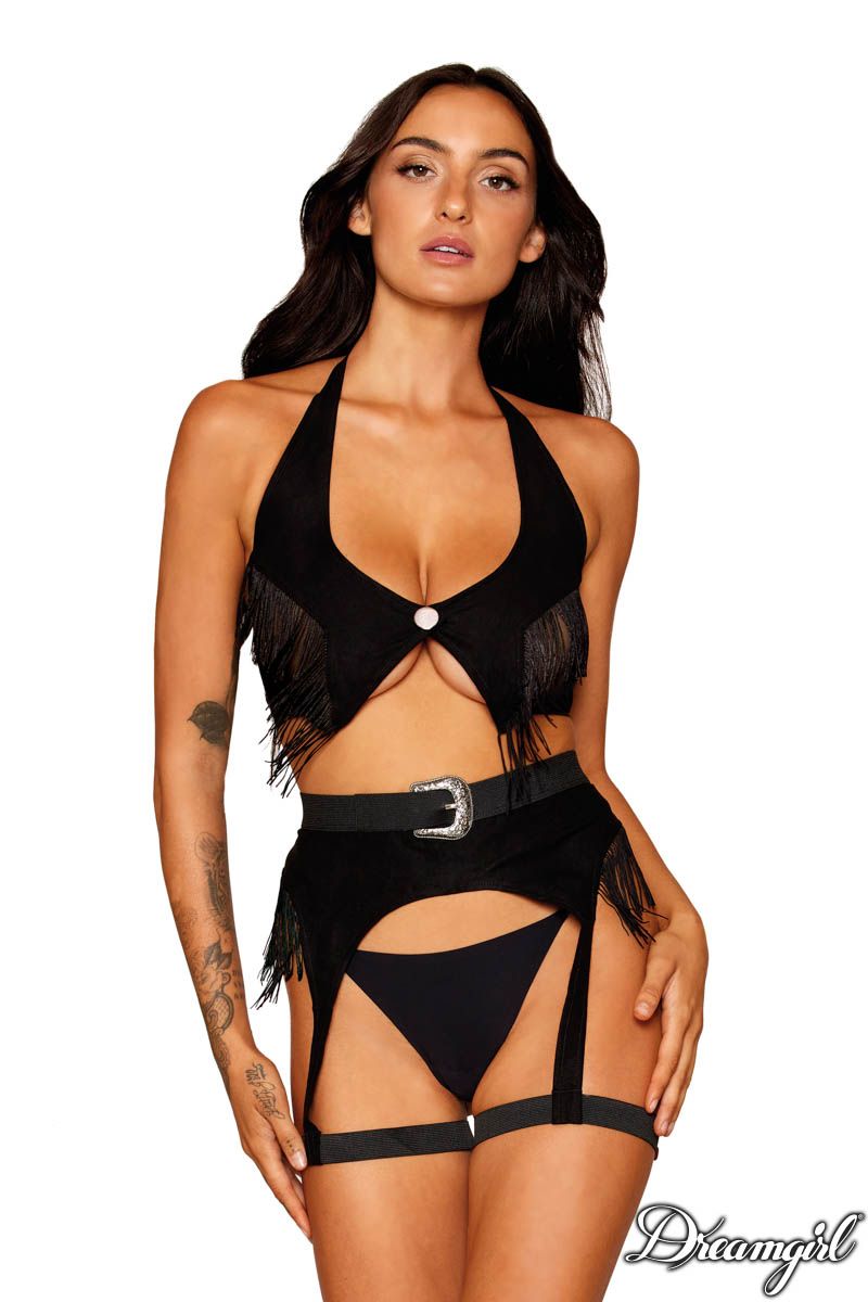 Step into sultry sophistication with our sleek faux-suede top featuring long fringes cascading over a daring open underbust. The halter tie-neck collar and dual tie-back closures enhance the allure of the open back. Paired with a high-waisted garter belt, adorned with dramatic fringes along the sides, a silver western-style decorative buckle, and an adjustable hook & loop back closure over a thick waistband, this ensemble ensures a perfect fit. Elastic garters, tied to thick elastic leg garters, complete the look, adding a touch of Western flair to your intimate wardrobe.