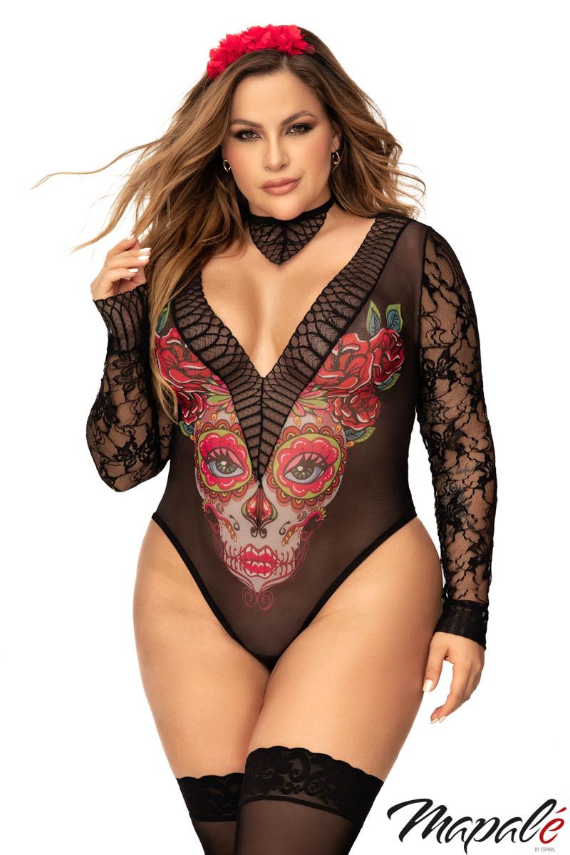 Sexy Catrina costume. Includes printed mesh bodysuit with floral lace sleeves and back, lace collar and head piece.