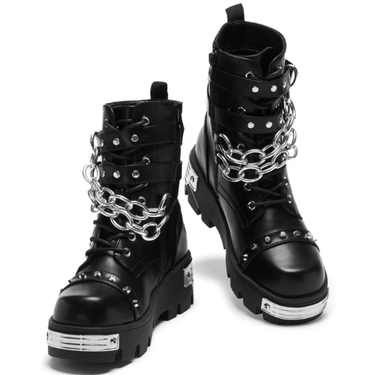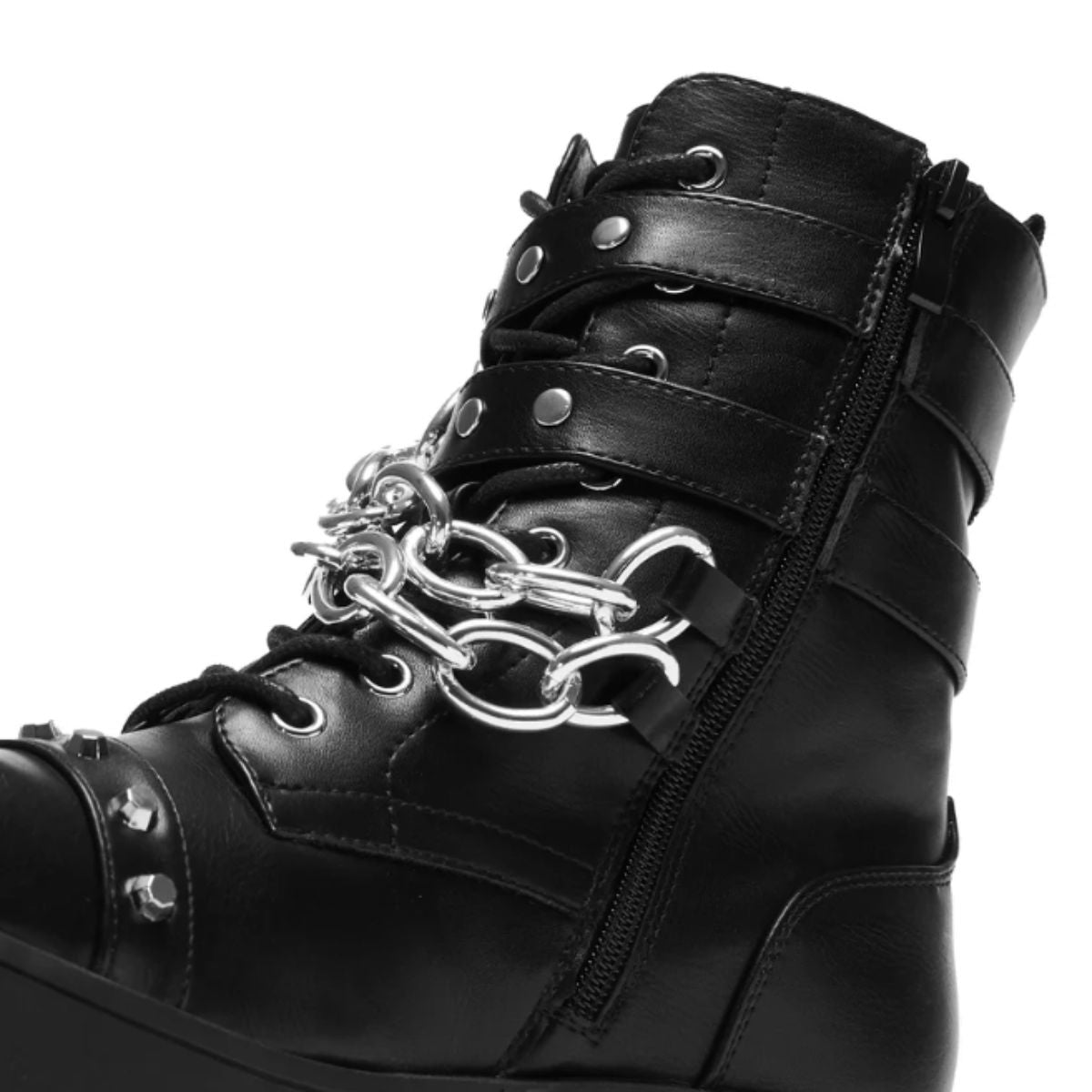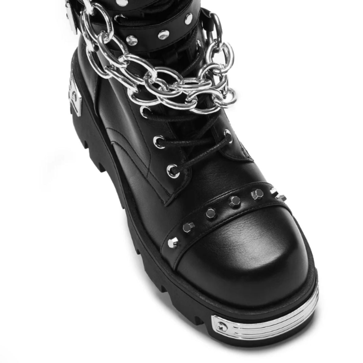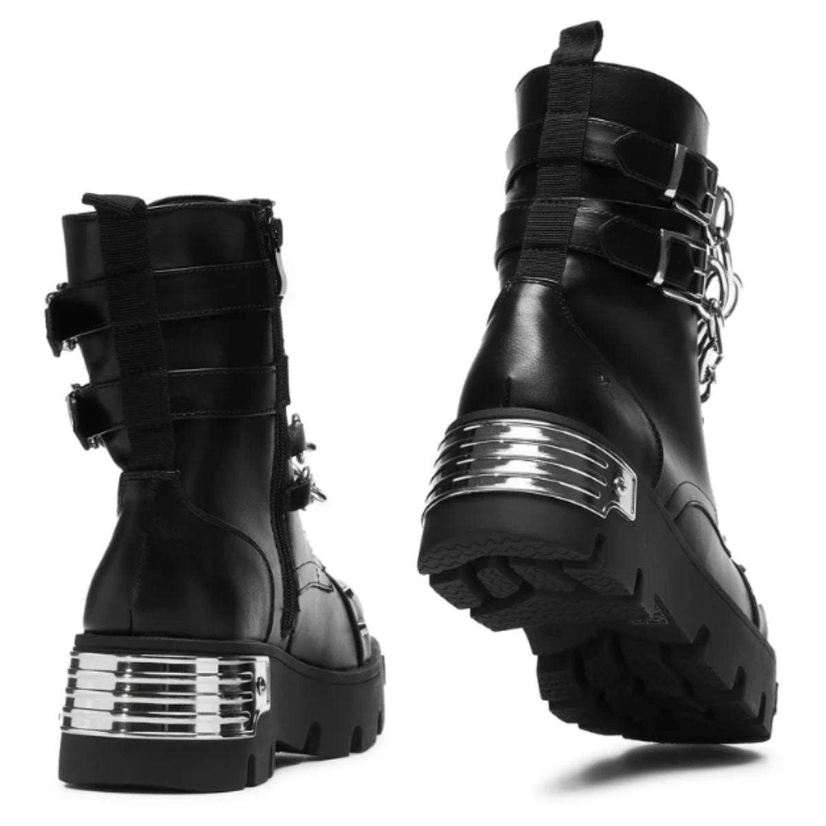 The Shackled Shadows boots are all about heavy-duty attitude. Built on a solid, chunky outsole with metal plates on the toe and heel, these boots bring that industrial grit KOI is known for. But it’s the details that take these to the next level—like the squared-off toe shape and the oversized silver chains draped across the front. The double buckle straps keep everything locked down, with the matching silver buckles syncing perfectly with the chains. The textured black faux leather finishes things off giving the whole style a gritty, rebellious vibe.