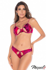Snakeskin print bra with open underwire cups, adjustable straps and hook and eye closure at back. Thong with open front and two back straps around the buttocks