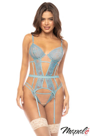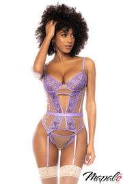 Sheer mesh bustier with underwired lace cups, silky adjustable straps, all-over elastic boning, adjustable garters with gold metal clips and 2 hook & eye back closures. (Matching G-String included)