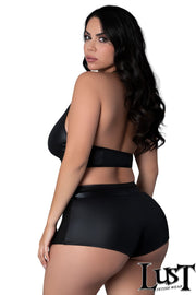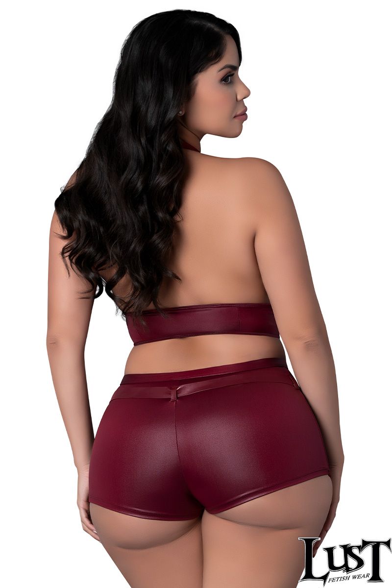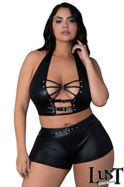 Glossy four-way stretch wet look top with adjustable buckles over the plunging front, decorative strappy elastics over soft cups and a halter tie-neck collar. Sleek high waist shorts with a wide waistband.