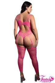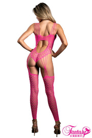 Big net garter teddy with shredded fixed elastic straps, an open crotch and attached strappy elastic garters linked to the matching thigh high stockings. (G-String not included)