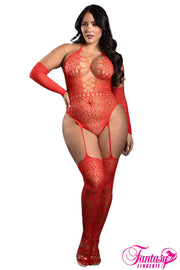 Fishnet garter teddy with criss-cross elastics over the plunging neckline, a halter tie-neck collar and attached elastic garters linked to the matching thigh high stockings. (Matching fingerless gloves included)