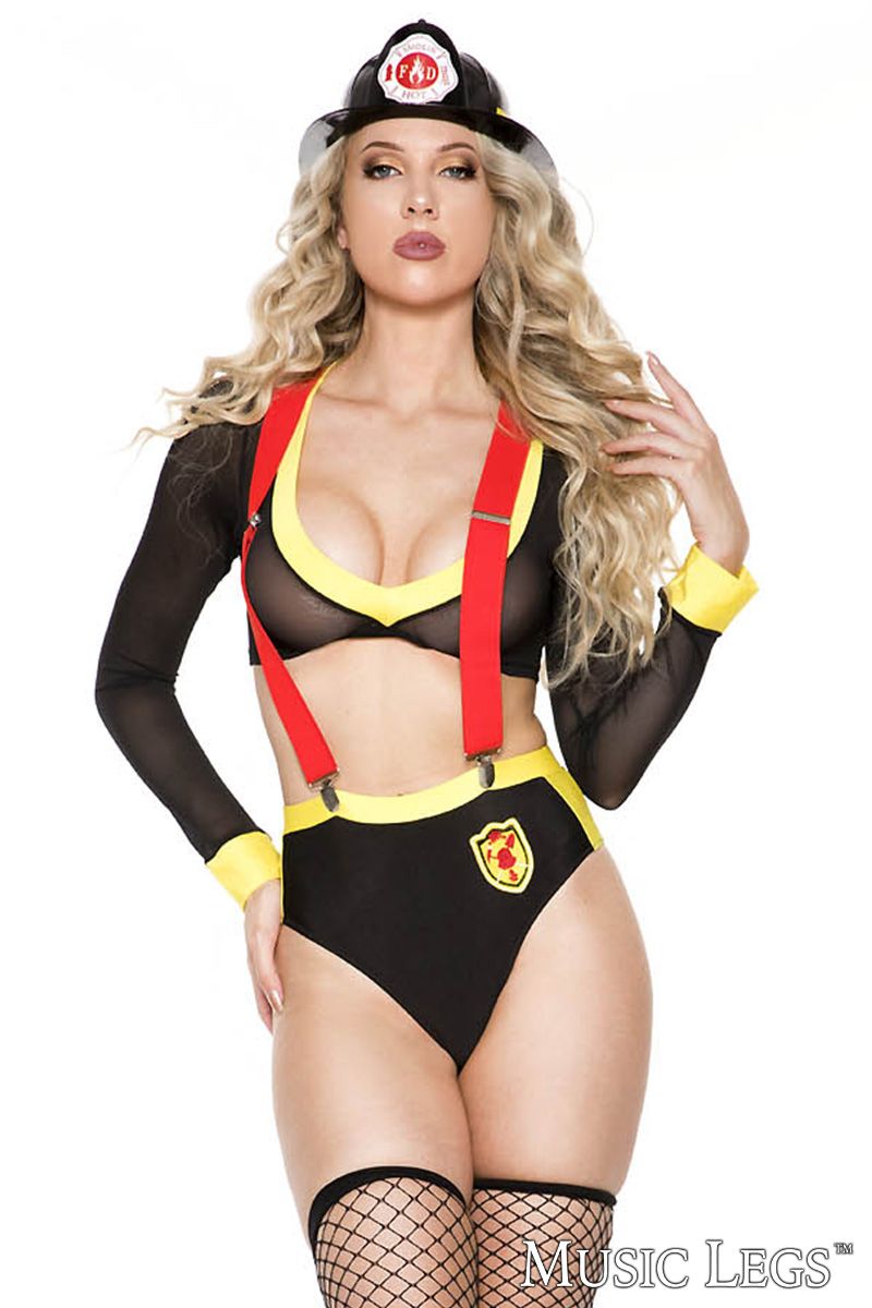 Long-sleeved sheer mesh top with a plunging front and a thick yellow trim. High-waisted panty with a thick yellow trim and a front print. Thick, adjustable red suspender straps with metal clips. Plastic firefighter hat