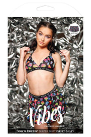 Rainbow mushroom mini skirt with a thick elastic waistband featuring a "WHY U TRIPPIN?" print and a wavy black hem. (Shown with 2PC Set FAAF960; not included)