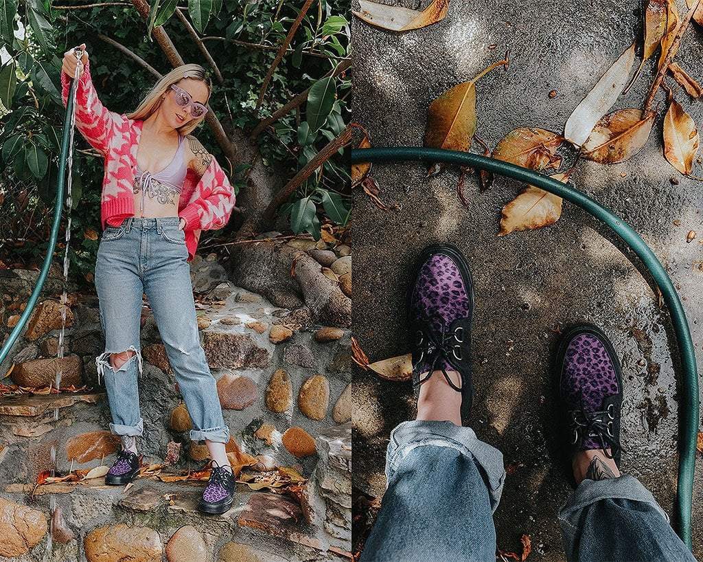 Rock your style in these timeless creeper sneakers. Get ready to hit the stage or the streets in these vulcanized sneakers that re-imagines our former creeper sneaker silhouette with bold & modern twists. Features a vegan black twill upper & purple leopard faux fur with classic D-rings iconic interlace detailing along the front. The fun animal print gives an extra dose of rock n' roll that looks great on guys & girls alike!