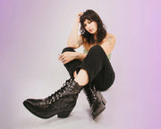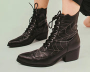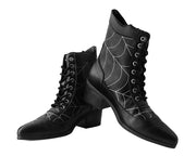 Footwear to bring out your dark side. Features a vegan friendly black faux leather upper with a pointed toe construction, spiderweb detailing and a 8-eye closure. Has a block heel height of 2 ¼”.